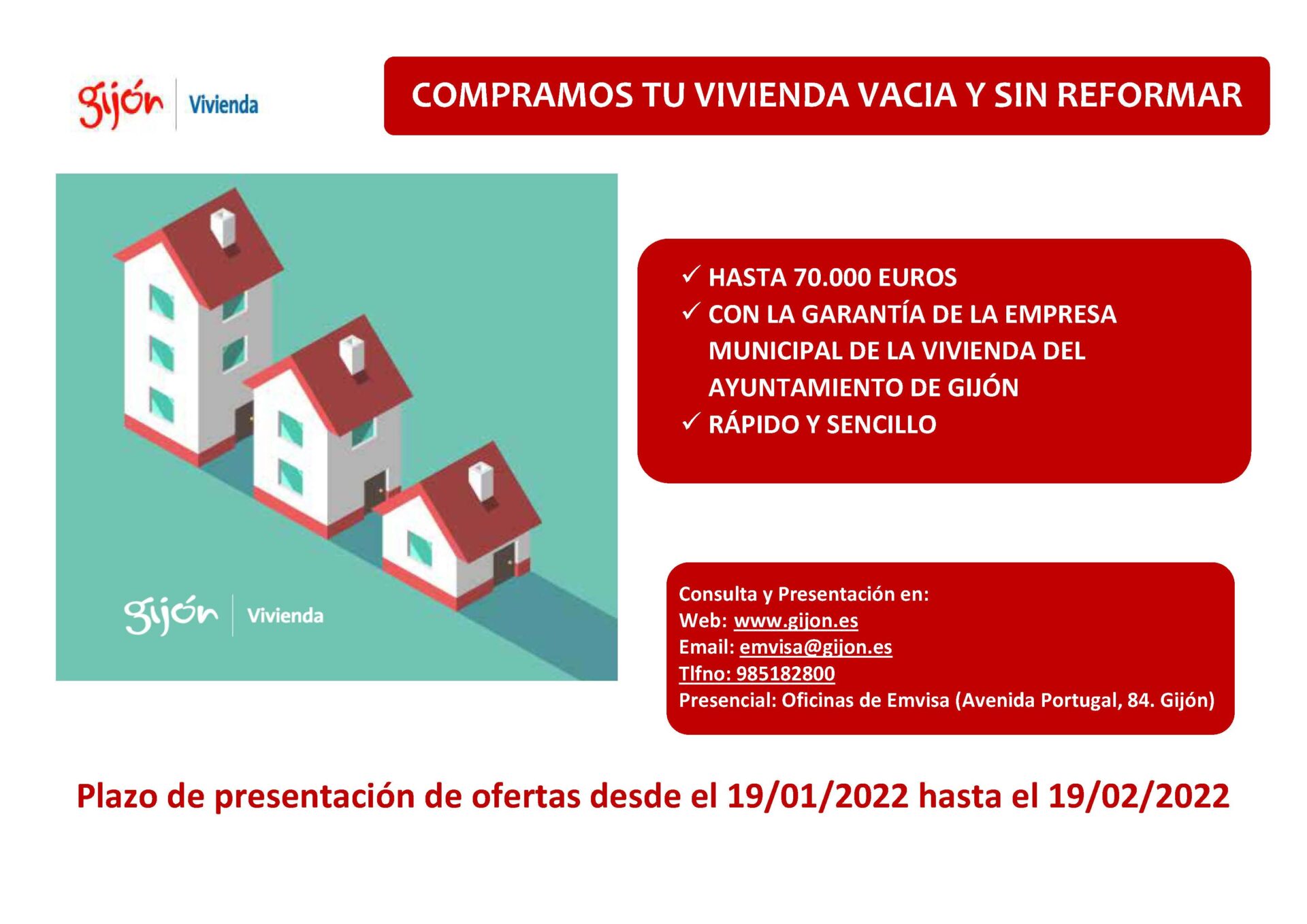 La Empresa Municipal de la Vivienda del Ayuntamiento de Gijón abre mañana miércoles, 19 de enero, el plazo de recepción de ofertas para la adquisición de viviendas dirigidas al alquiler social. El objetivo de este proceso de compra, que cuenta… Leer más »EMVISA abre el plazo de ofertas para la compra de viviendas dirigidas al alquiler social